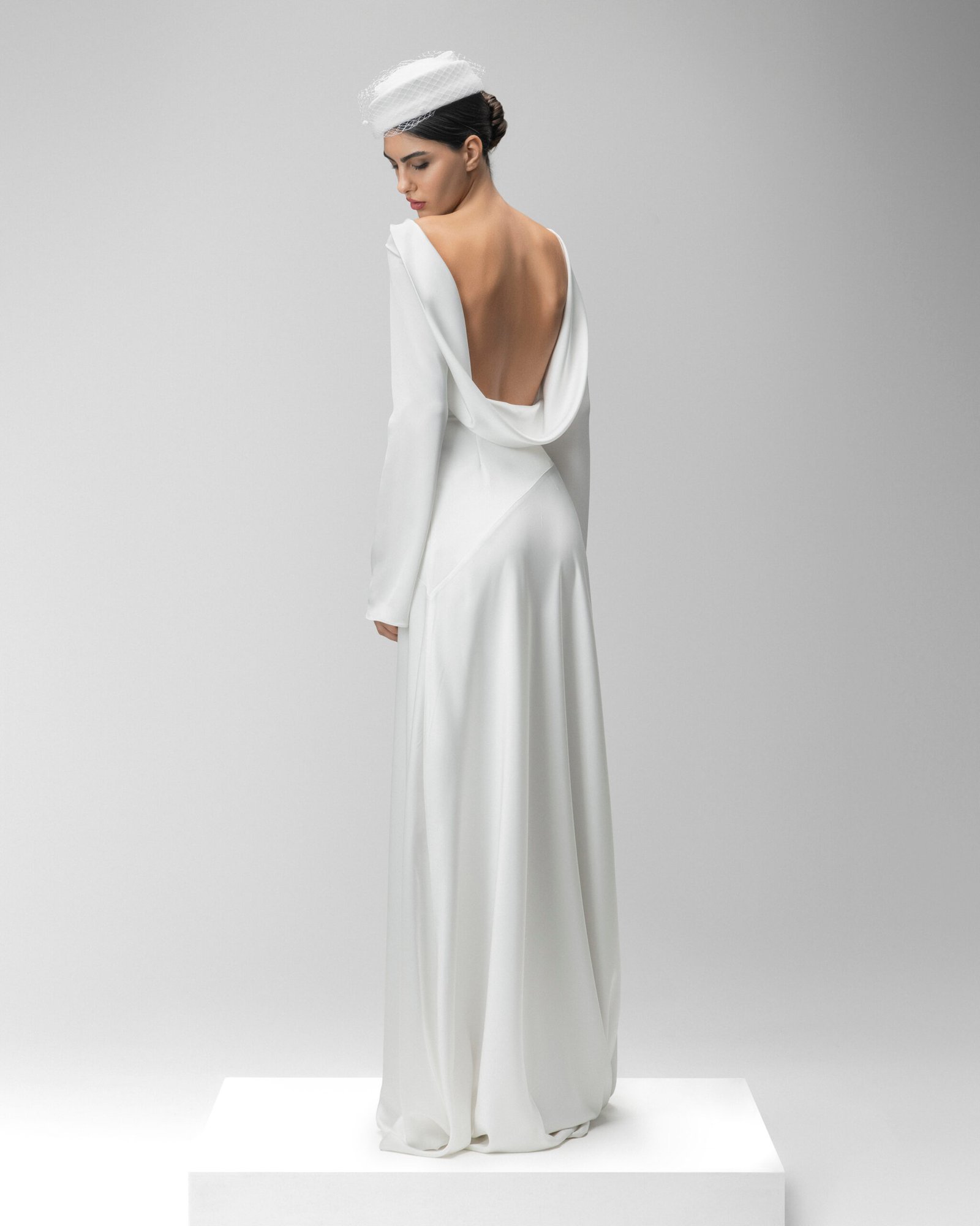 Charlotte is designed with a smooth, light fabric which leads into long, faintly flared sleeves and a low back, allowing it to drape into a soft cowl. The skirt of the dress wraps into a floor-length gown, pooling subtly at the hem.